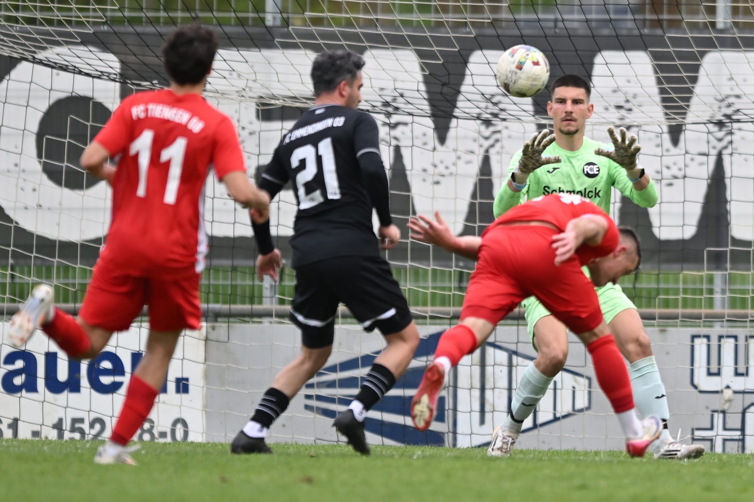 Auch wer in dieser Landesligapartie des FCE gegen die Gäste vom Hochrhein, den FC 08 Tiengen, nur 20 Minuten nicht rechtzeitig zum Anstoß im Stadion war, verpasste einen torreichen Auftakt. Wohl sehr gut dem SC Freiburg im Europa-League Viertelfinale gegen Celtic Vigo zugeschaut hatte Mittelfeldakteur Celal Öncue. Sein absolut sehenswerter Führungstreffer in der vierten Minute war eine Blaupause zum Führungstreffer des SC durch Vincenzo Grifo! Mit einem echten Doppelschlag nur eine Minute später hieß es 2:0 für das Dewes/Grießbaum-Team. Nebil Vanci knallte die Kugel mit einem Hammertor unter die Latte. Ein Auftakt nach Maß und ganz nach dem Geschmack der über 200 Zuschauern im Elzstadion. Doch damit nicht genug. Der FCE machte weiter wie genau schon eine Woche zuvor in Rheinfelden und Marko Radovanovic stellte in der 16. Minute auf 3:0. Aber die in rot gekleideten Gäste vom Hochrhein steckten nicht auf und kamen in der 19. Minute nach einer Standardaktion durch ihren auffälligsten Akteur, dem 37-jährigen Routinier Nexhdet Gusturanaj, zum 3:1 Anschlußtreffer. Der spielende Co-Trainer Jakob Grießbaum war es dann, der in der 31. Minute den alten Torabstand wiederherstellte durch seinen Treffer zum Halbzeitstand von 4:1. Die Zuschauer quittierten die gute erste Halbzeit ihres FCE mit berechtigtem Applaus. In der zweiten Halbzeit verflachte die Partie allerdings aus Emmendinger Sicht. So kamen die Gäste, die immer wieder ihre bekannte spielerische Klasse auch auf den Platzt brachten, zu mehr Spielanteilen und auch Torabschlüssen. Was aber die gute Defensivarbeit der FCE-Verteidiger nicht entschärfen konnte, machte der starke FCE-Keeper Yannick Ritter wieder wett. Bei zwei Aktionen hatte der Tiengener Anhang bestimmt bereits schon den Torschrei auf den Lippen, doch da war eben Yannick Ritter zur Stelle und hielt seinen Kasten sauber. Quasi mit dem Schlußpfiff gelang dem 15 Minuten zuvor eingewechselten Leon Beckmann mit einem sehenswerten direkt verwandelten Freistoß der Endstand zum 5:1. Fünf FCE-Treffer an diesem Nachmittag mit fünf verschiedenen Torschützen! In 2026 bleibt die Mannschaft um Kapitän Fabian „Faber“ Strittmatter demnach weiterhin ungeschlagen. Aus sieben Spielen in diesem Kalenderjahr stehen bislang fünf Siege und zwei Unentschieden zu Buche! Mit starken 39 Punkten rangiert die Mannschaft als Aufsteiger auf Rang drei der aktuellen Landesligatabelle. Durch die guten Auftritte aus den letzten Partien fährt man jetzt selbstbewußt wieder an den Hochrhein. Die „Hochrheinspiele“ dieser Wochen wird fortgesetzt am kommenden Samstag beim FV Lörrach-Brombach. Anstoß im Grüttpark ist um 16:00 Uhr. Der FCE setzt einen Bus ein. Wer gerne die Mannschaft vor Ort in dieser Partie unterstützen möchte (Abfahrt: 13:15 Uhr am FCE Elzstdaion), bitte gegen einen Kostenbeitrag von Euro 15,– anmelden bei Marcus Mädler unter Tel.: 0172/7607768 oder Mail: marcus.maedler@gmx.de