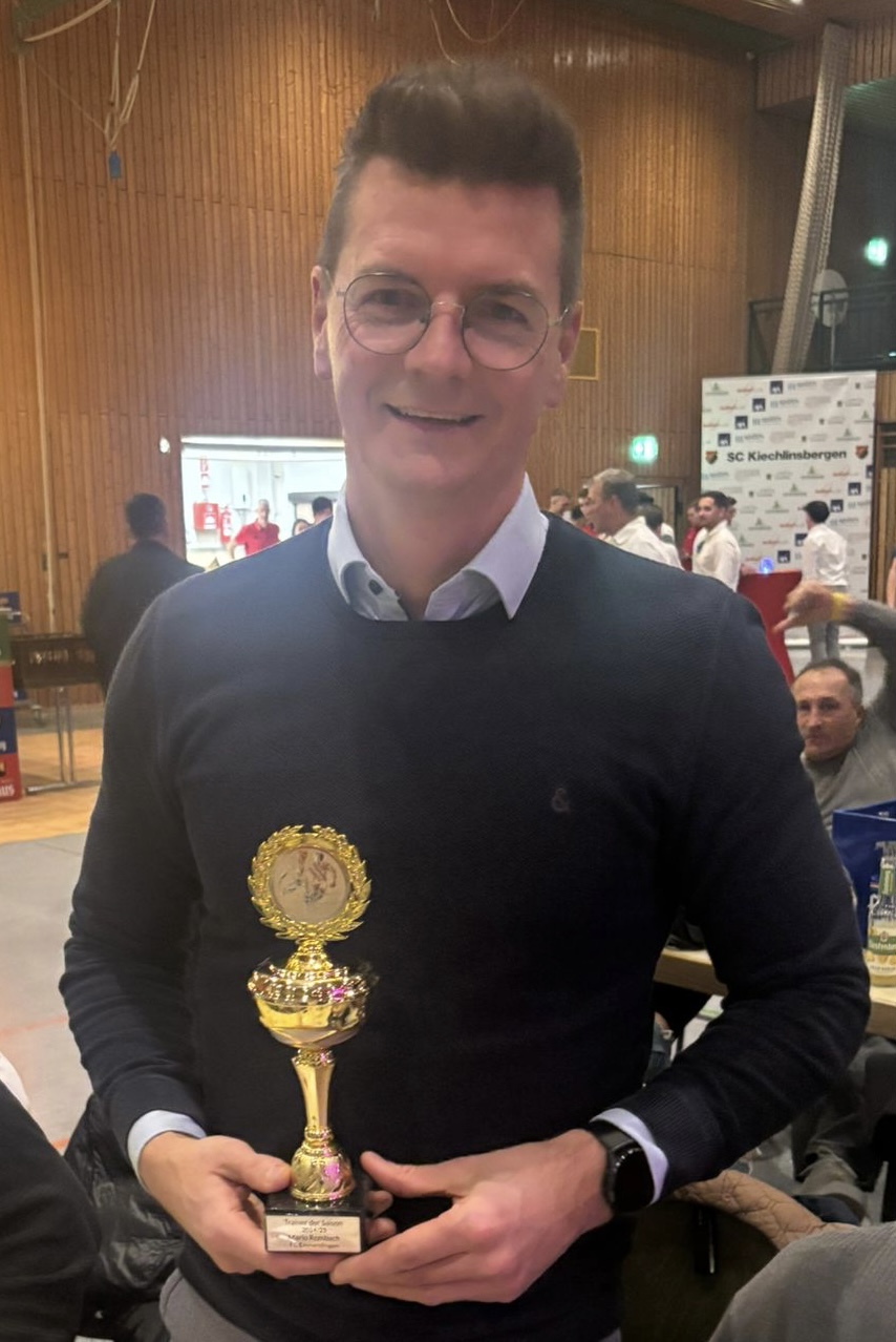 Mario Rombach, Meistertrainer des FCE der Saison 2024/25, wurde bei der Sportgala des Fußballmagazins „Südbadens Doppelpass“ als einer der Trainer des Jahres ausgezeichnet. Zusammen mit Marco Schneider (FC Auggen), Marco Dufner (FC Denzlingen) und Giuseppe Paletta (SV BW Waltershofen) konnte der aktuelle Trainer im Ruhestand die begehrte Trophäe in Empfang nehmen. Der FCE freut sich mit seinem ehemaligen Cheftrainer.